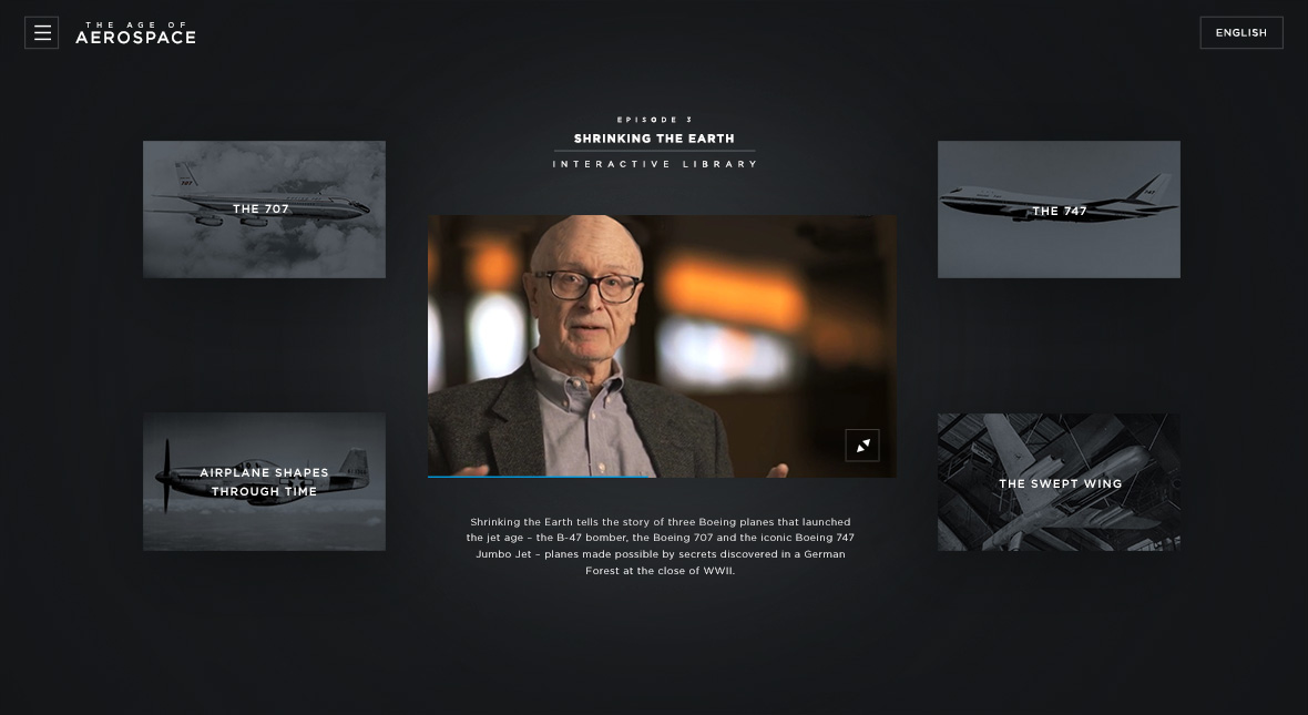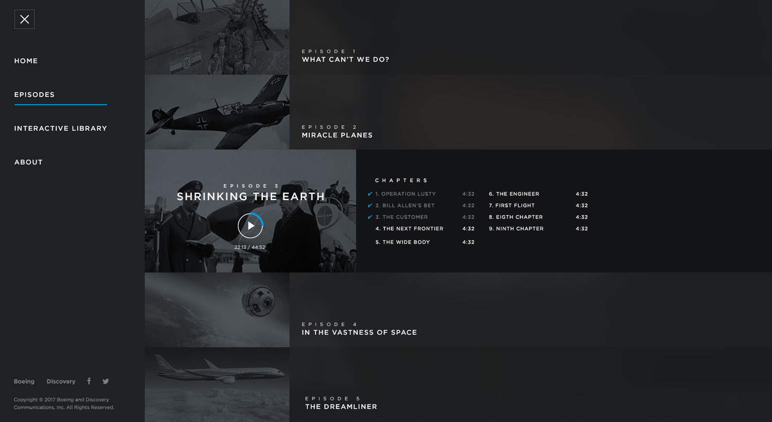 The Age of Aerospace explores the last 100 years of aviation history in unprecedented detail. Working alongside Boeing and "The Documentary Group", I was tasked with the architecture and visual design of a global streaming experience that showcased the 8 full episodes of the documentary "The Age of Aerospace". The website, which has been fully translated into 17 languages, is made up of interactive videos and over 300 pages of interactive content. The project has garnered the recognition of prestigious awards such as The Webby Awards, the iab mixx awards and the Digiday Awards.