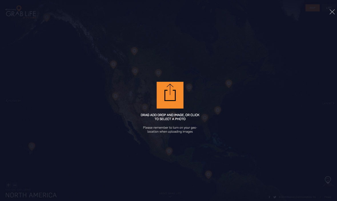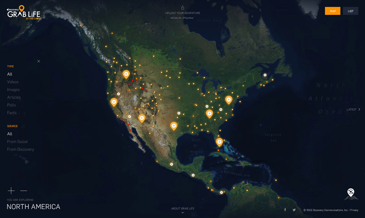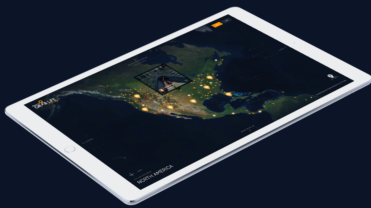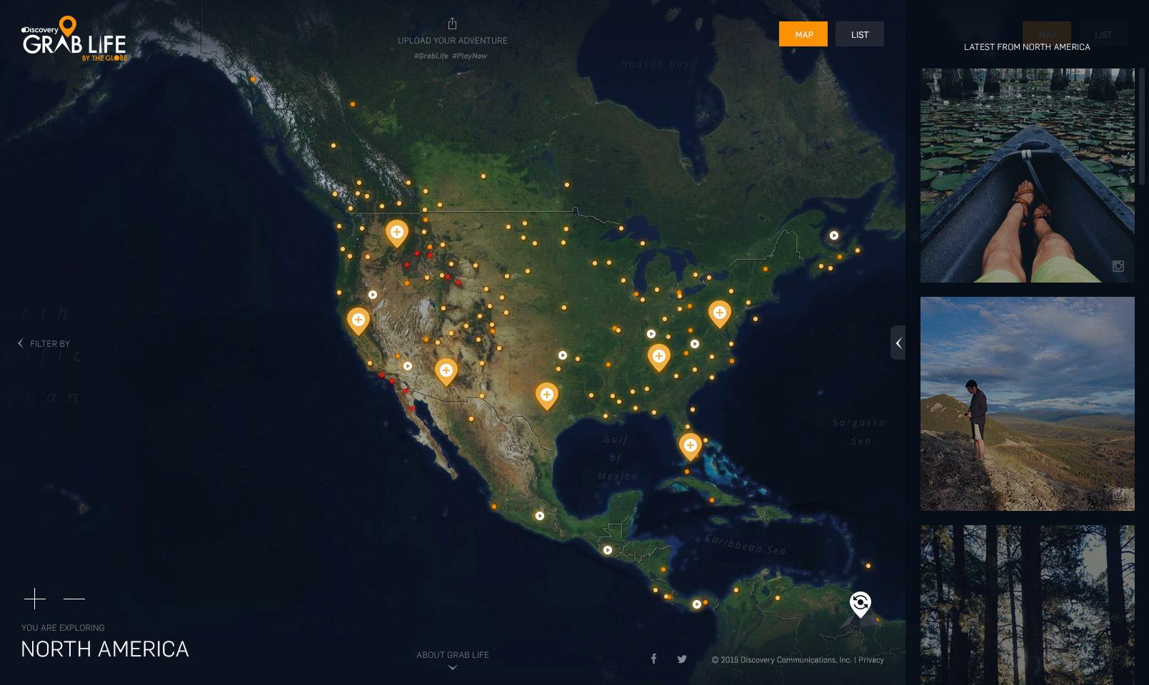Explore the remote, rugged corners of the world and turn no man's land into your land! Partnering with Toyota's agency Satch and Saatchi, I led the design of a unique social destination where we encouraged users to submit their outdoor aventures via the hashtag #grablife. We then aggregated all the user generated content and displayed it whithin a map style interface allowing adventure seekers to truly explore the world. The map was also populated with Discovery channel's content from across the globe.