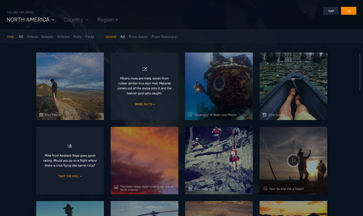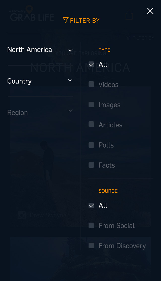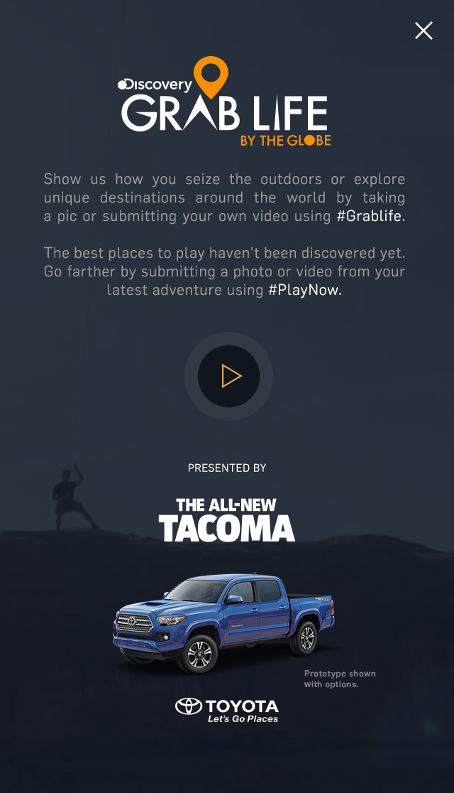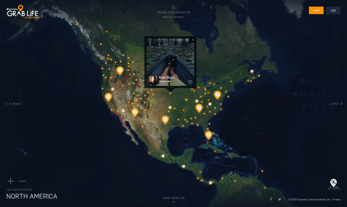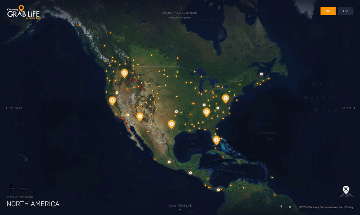 Explore the remote, rugged corners of the world and turn no man's land into your land! Partnering with Toyota's agency Satch and Saatchi, I led the design of a unique social destination where we encouraged users to submit their outdoor aventures via the hashtag #grablife. We then aggregated all the user generated content and displayed it whithin a map style interface allowing adventure seekers to truly explore the world. The map was also populated with Discovery channel's content from across the globe.