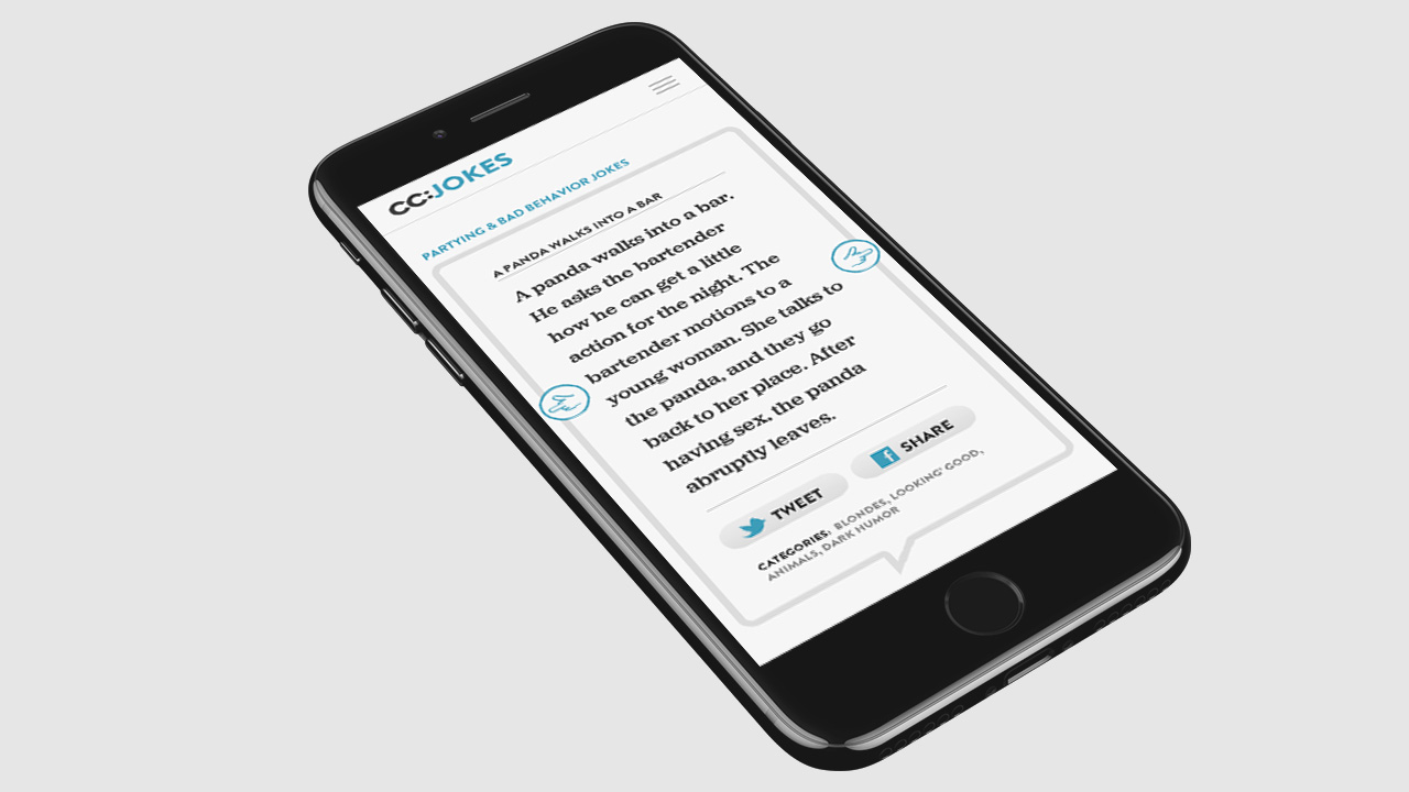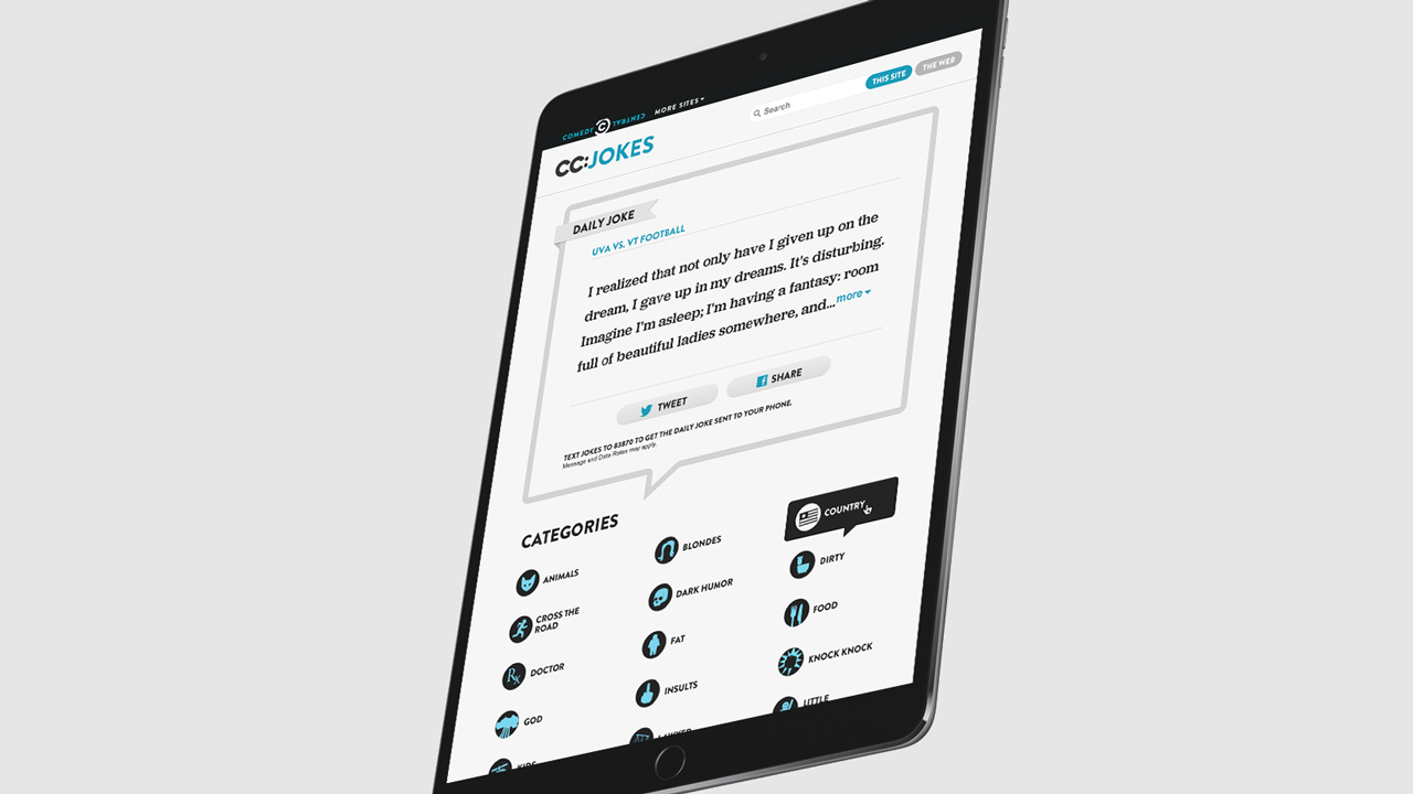 Jokes.com is the #1 jokes site on the Internet. When it came time to the redesign of the website and give the site a new identity, Comedy Central gave me the task of rethinking the way jokes were being presented on the web across multiple devices. I came up with a whole new visual design for the site and designed an interface where the joke is the main focal point at all time. With a library of over 40,000 jokes, the user experience needed to be clean and simple.