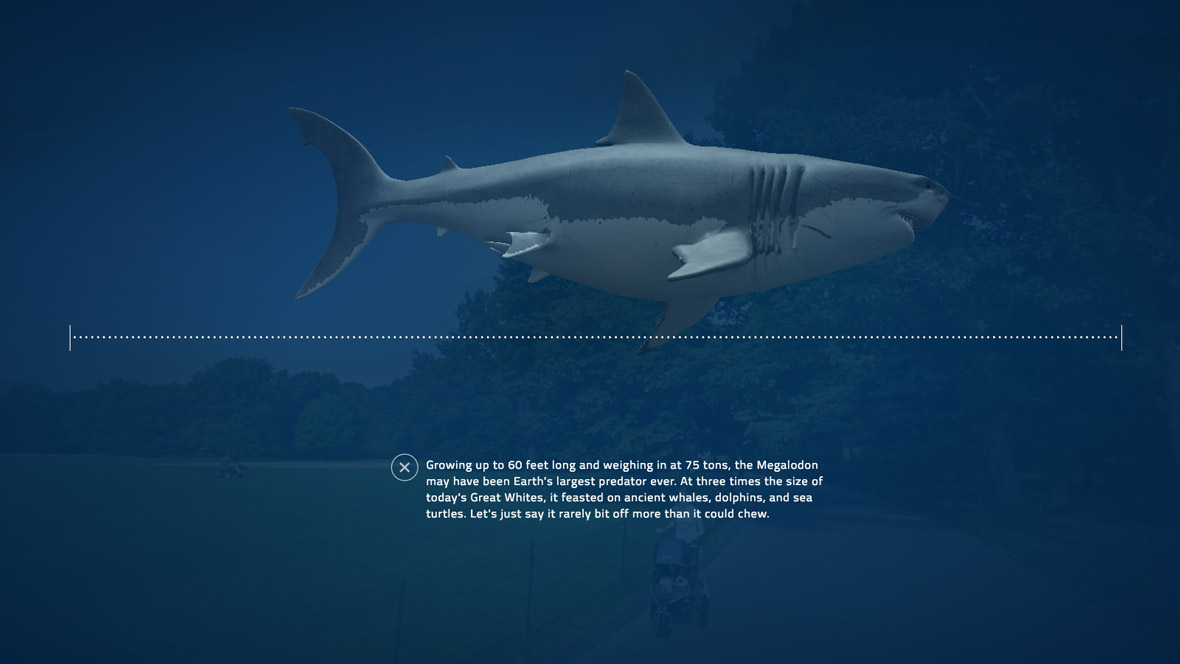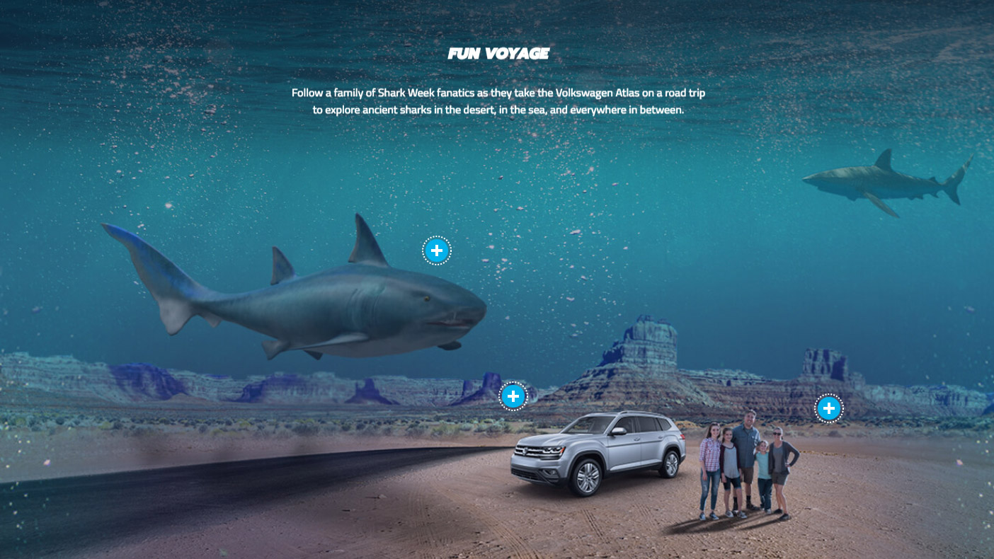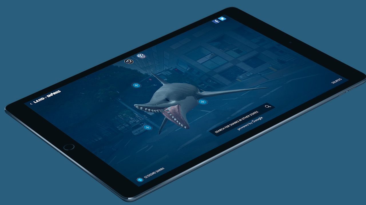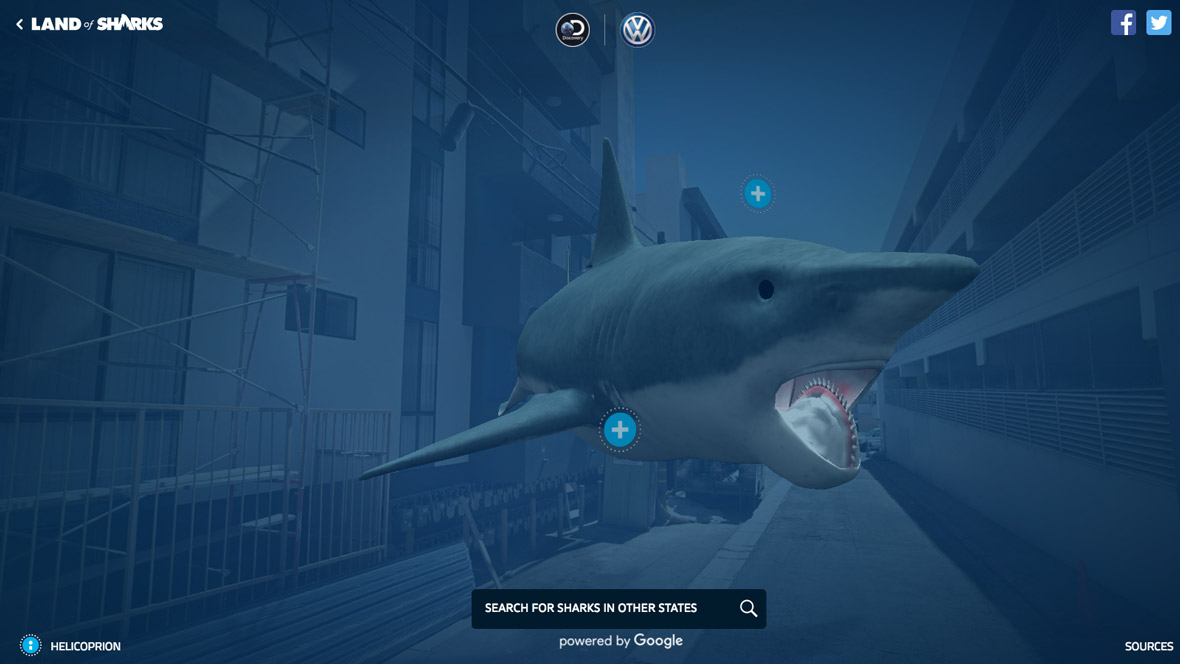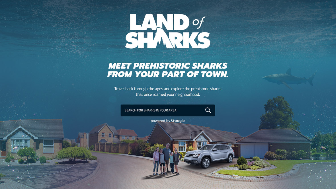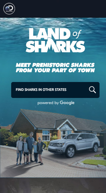 Millions of years ago, ancient oceans covered much of the United States and prehistoric sharks roamed where we live today. To celebrate Shark Week, Discovery partnered with Volkswagen to create the "Land of Sharks". Using Google Street View Image API and WebGL, we crafted and developed an immersive 3D experience where users can type in their location and travel back in time to learn more about prehistoric sharks that used to roam their area. As part of the experience, we also followed a family on a journey across America to learn more about ancient sharks and documented their road trip through interactive content.