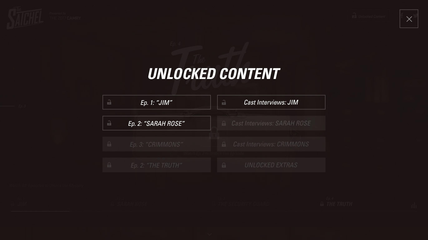Are you a good detective? Or, Do you just like a good story? The Satchel is the first experimental series told in Virtual Reality. To satisfy Invesgation Discovery's audiences mystery cravings, I was in charge of leading the a design experience where users would go through a series of videos to unlock the ultimate mystery of who stole the satchel. By watching each video, users would unlock the next clue in the plot as well as behind the scenes content.